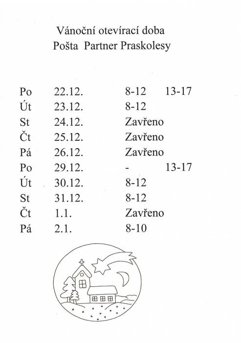 Úvod > O obci > Aktuality > Vánoční otevírací doba na Poště Partner Praskolesy
