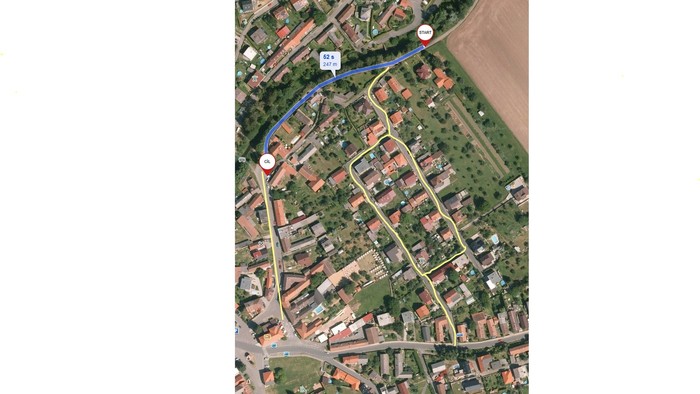 od pondělí 1. 12. 2025 bude pokračovat výstavba splaškové kanalizace na pravém břehu potoka od lávky u čp. 264 (Procházkovi) směrem do vsi (modrá barva).